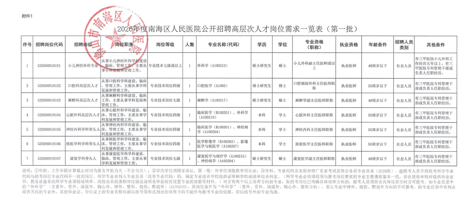 1.2026 年南海区人民医院公开招聘高层次人才岗位需求一览表(第一批)